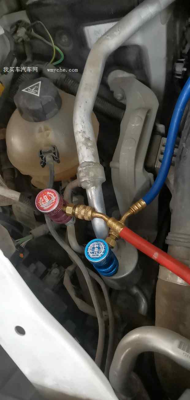 C4毕加索行驶52000公里,空调不制冷,到店检查,接上氟表查看制冷剂不足,保压有漏点,直接查看冷凝器发现上面有俩片油迹,这是漏了。正好清洗一下水箱,拆杠更换冷凝器后加上制冷剂正常...